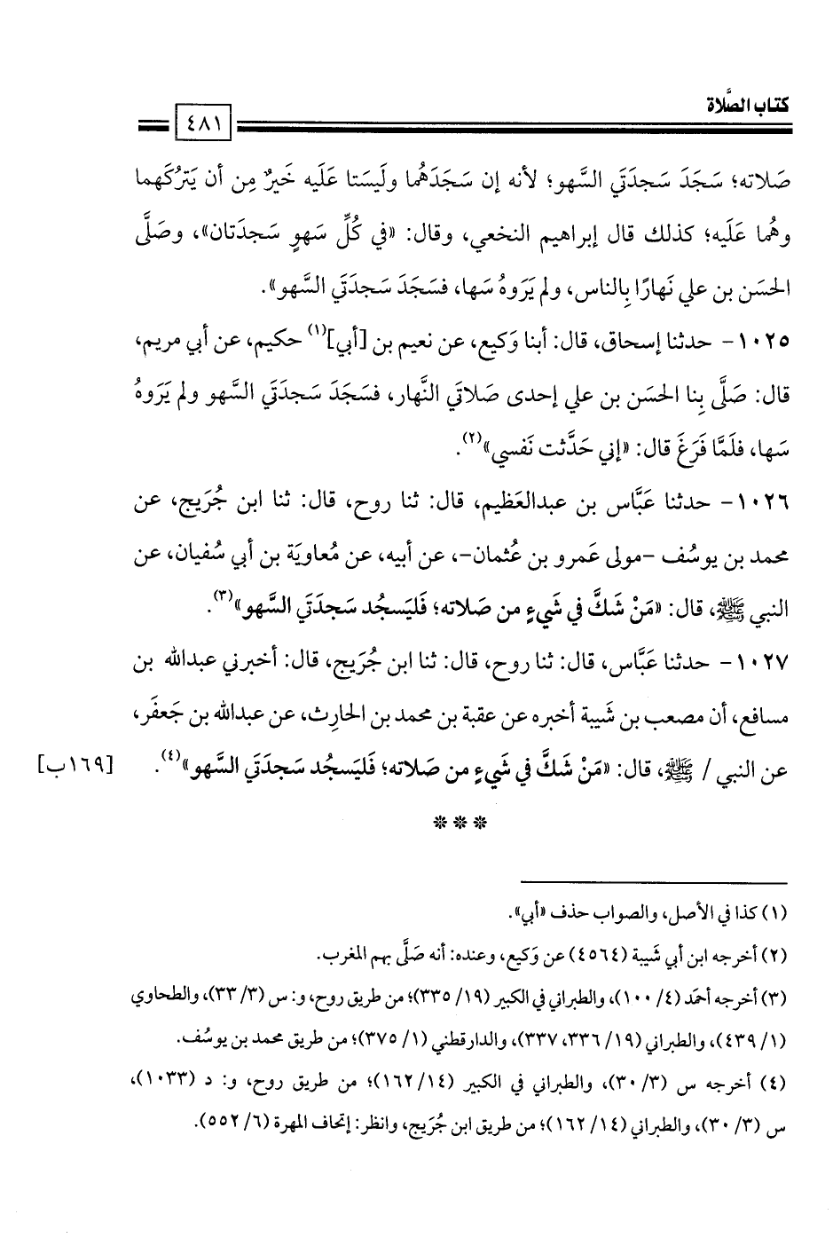 1027 - حدثنا عَبَّاس، قال: ثنا روح، قال: ثنا ابن جُرَيج، قال: أخبرني عبد الله بن مسافع، أن مصعب بن شَيبة أخبره عن عقبة بن محمد بن الحارِث، عن عبد الله بن جَعفَر، عن النبي صلى الله عليه وسلم، قال: «مَنْ شَكَّ في شَيءٍ من صَلاته؛ فَليَسجُد سَجدَتَي السَّهو».