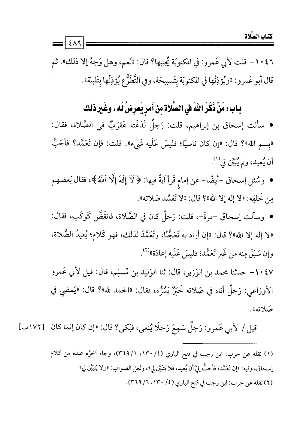 • سألت إسحاق بن إبراهيم، قلت: رَجلٌ لَدَغَته عَقرَبٌ في الصَّلاة، فقال: «بِسم الله»؟ قال: «إن كان ناسيًا؛ فليسَ عَلَيه شَيء». قلت: فإن تَعَمَّد؟ فأحَبَّ أن يُعيد، ولم يُبَيِّن لي.