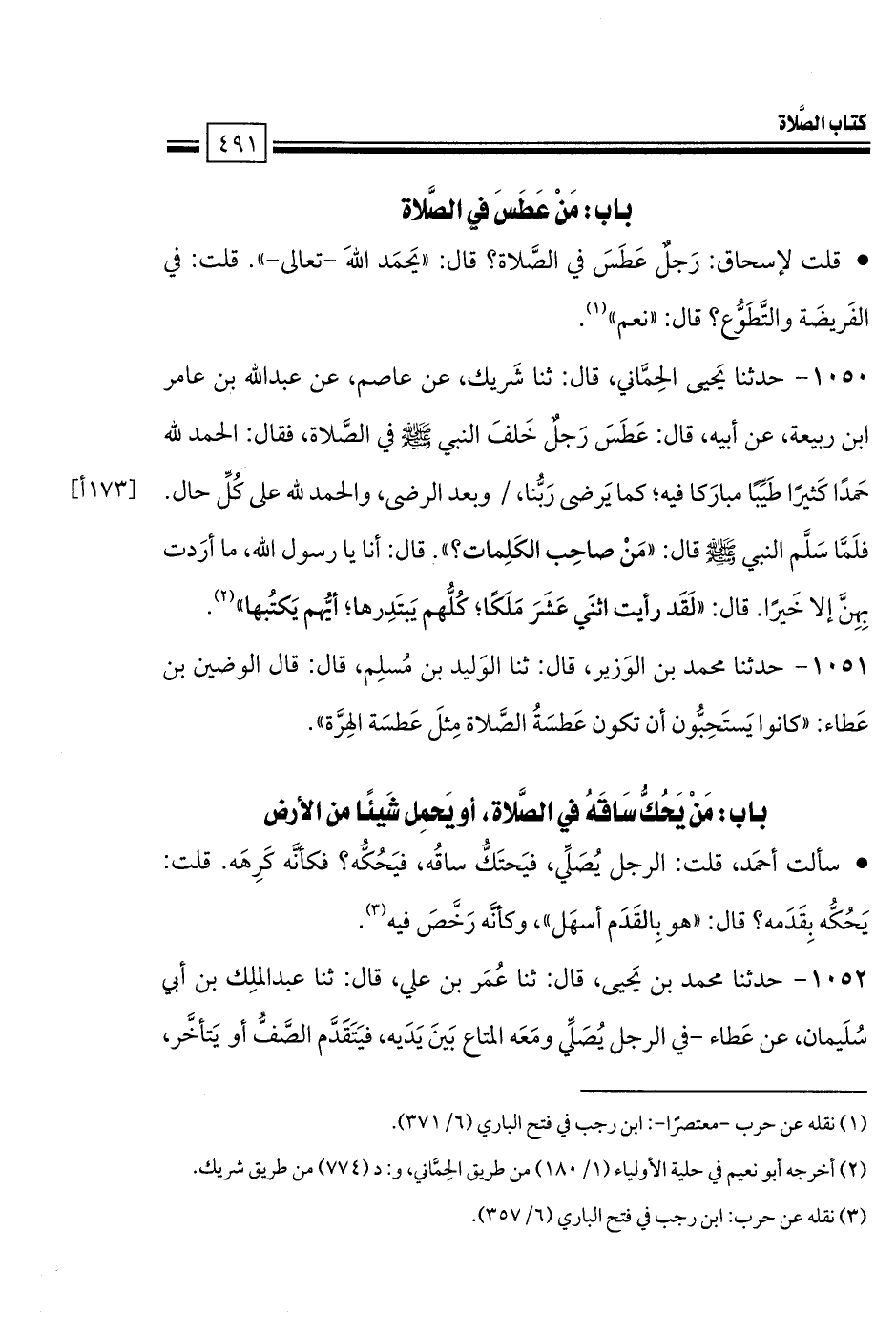 • قلت لإسحاق: رَجلٌ عَطَسَ في الصَّلاة؟ قال: «يَحمَد اللهَ -تعالى-». قلت: في الفَريضَة والتَّطَوُّع؟ قال: «نعم».