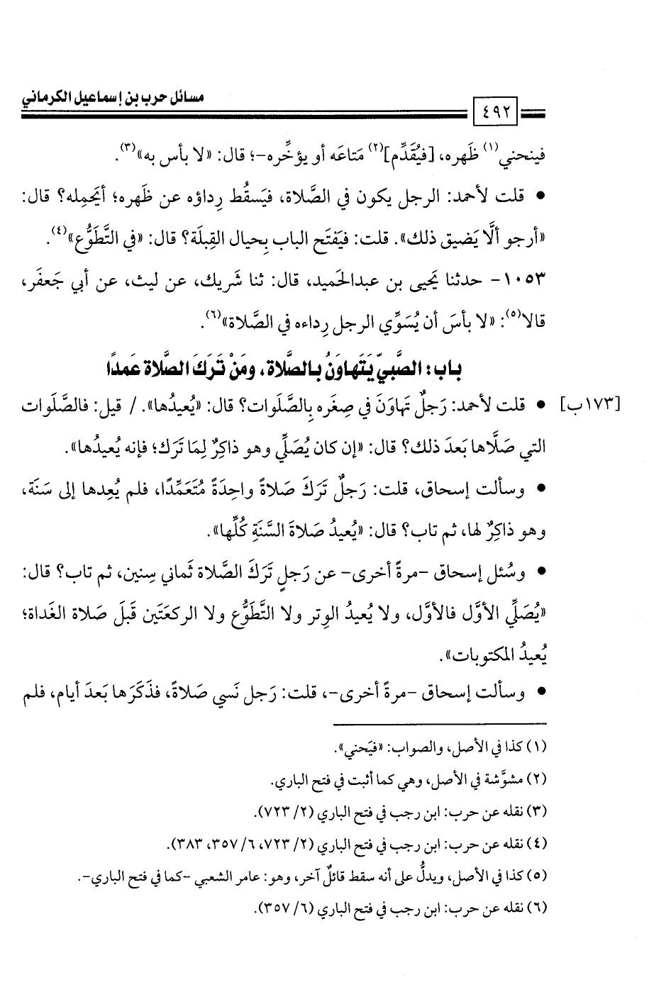 كتاب مسائل حرب الكرماني كتاب الطهارة والصلاة - ت السريع