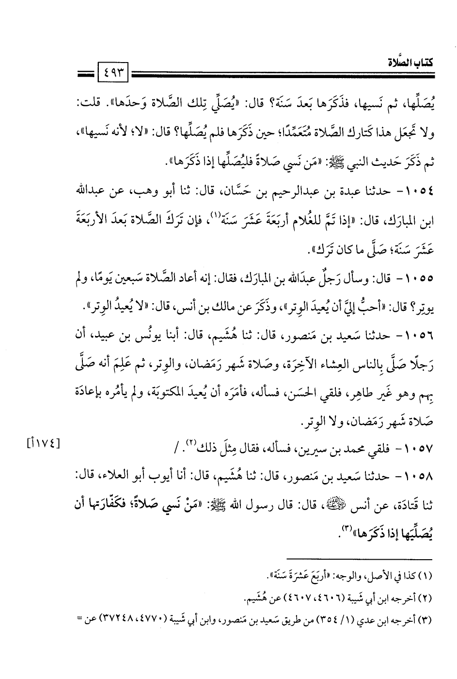 1058 - حدثنا سَعيد بن مَنصور، قال: ثنا هُشَيم، قال: أنا أيوب أبو العلاء، قال: ثنا قَتادَة، عن أنس -رضي الله عنه-، قال: قال رسول الله صلى الله عليه وسلم: «مَنْ نَسي صَلاةً؛ فكَفّارَتها أن يُصَلِّيَها إذا ذَكَرَها».