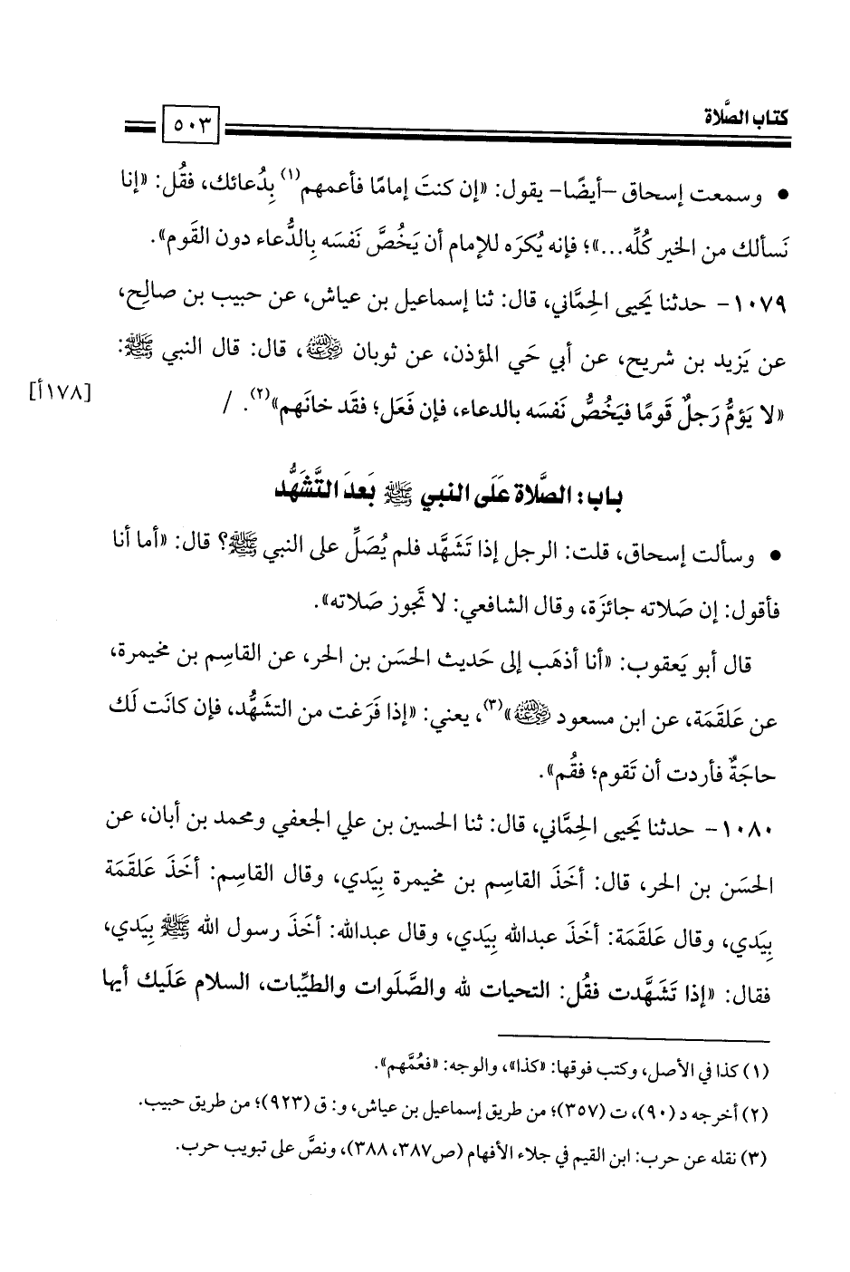 • وسألت إسحاق، قلت: الرجل إذا تَشَهَّد فلم يُصَلِّ على النبي صلى الله عليه وسلم؟ قال: «أما أنا فأقول: إن صَلاته جائزَة، وقال الشافعي: لا تَجوز صَلاته».
