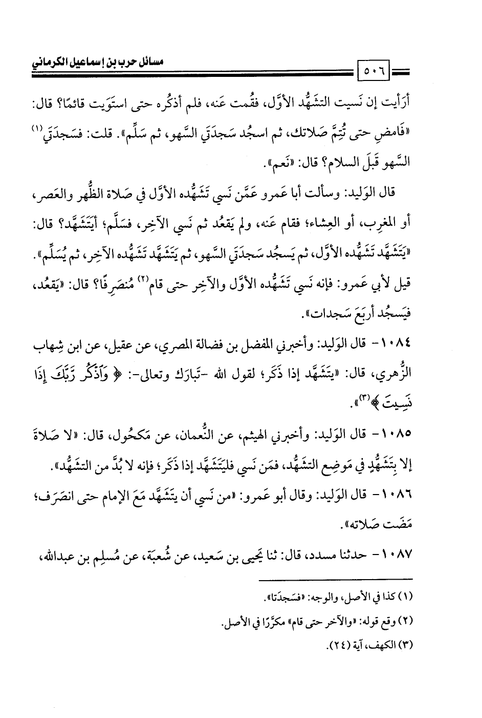 1085 - قال الوَليد: وأخبرني الهيثم، عن النُّعمان، عن مَكحُول، قال: «لا صَلاةَ إلا بِتَشَهُّدٍ في مَوضِع التشَهُّد، فمَن نَسي فليَتَشَهَّد إذا ذَكَر؛ فإنه لا بُدَّ من التشَهُّد».