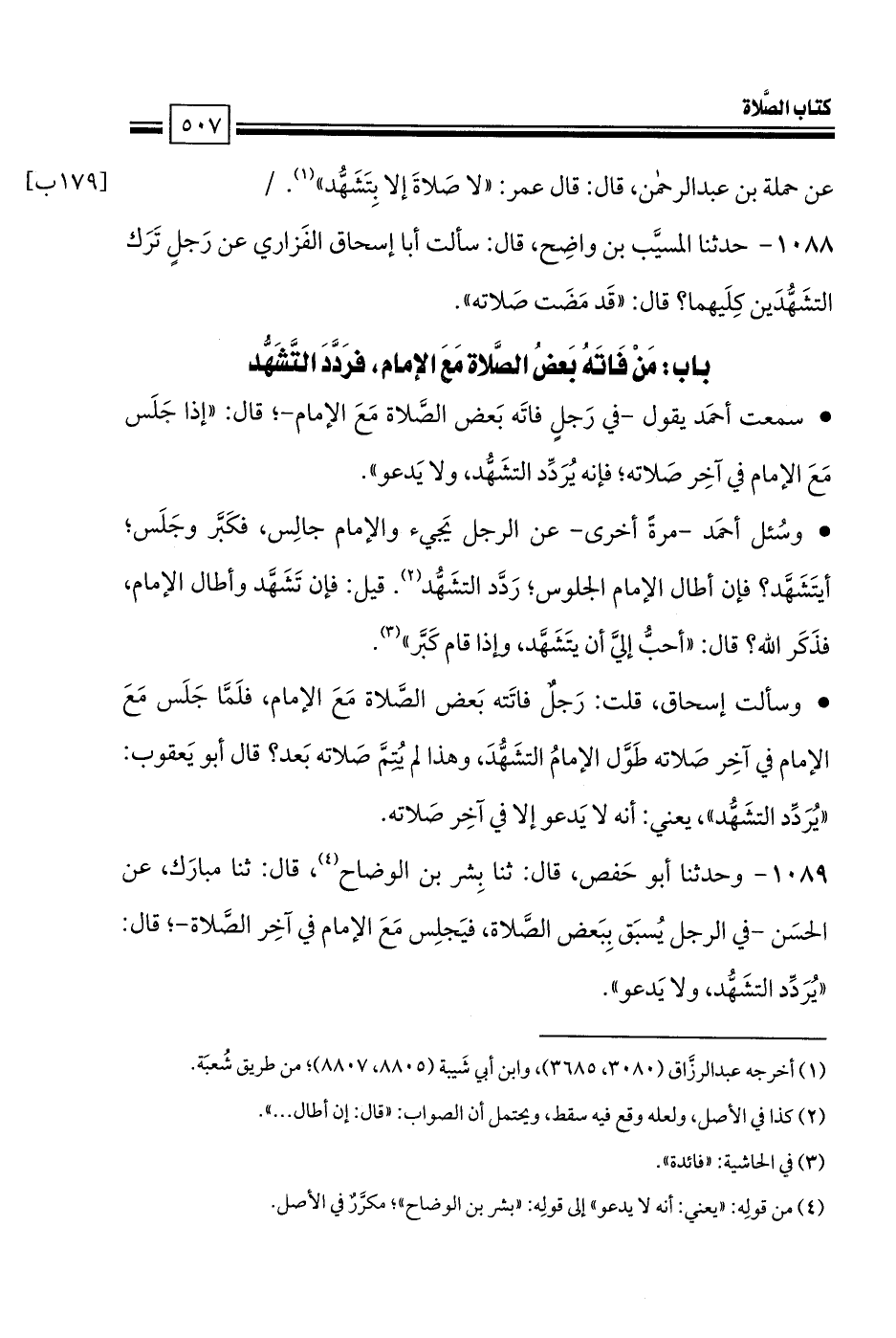 1088 - حدثنا المسيَّب بن واضِح، قال: سألت أبا إسحاق الفَزاري عن رَجلٍ تَرَك التشَهُّدَين كِلَيهما؟ قال: «قَد مَضَت صَلاته».