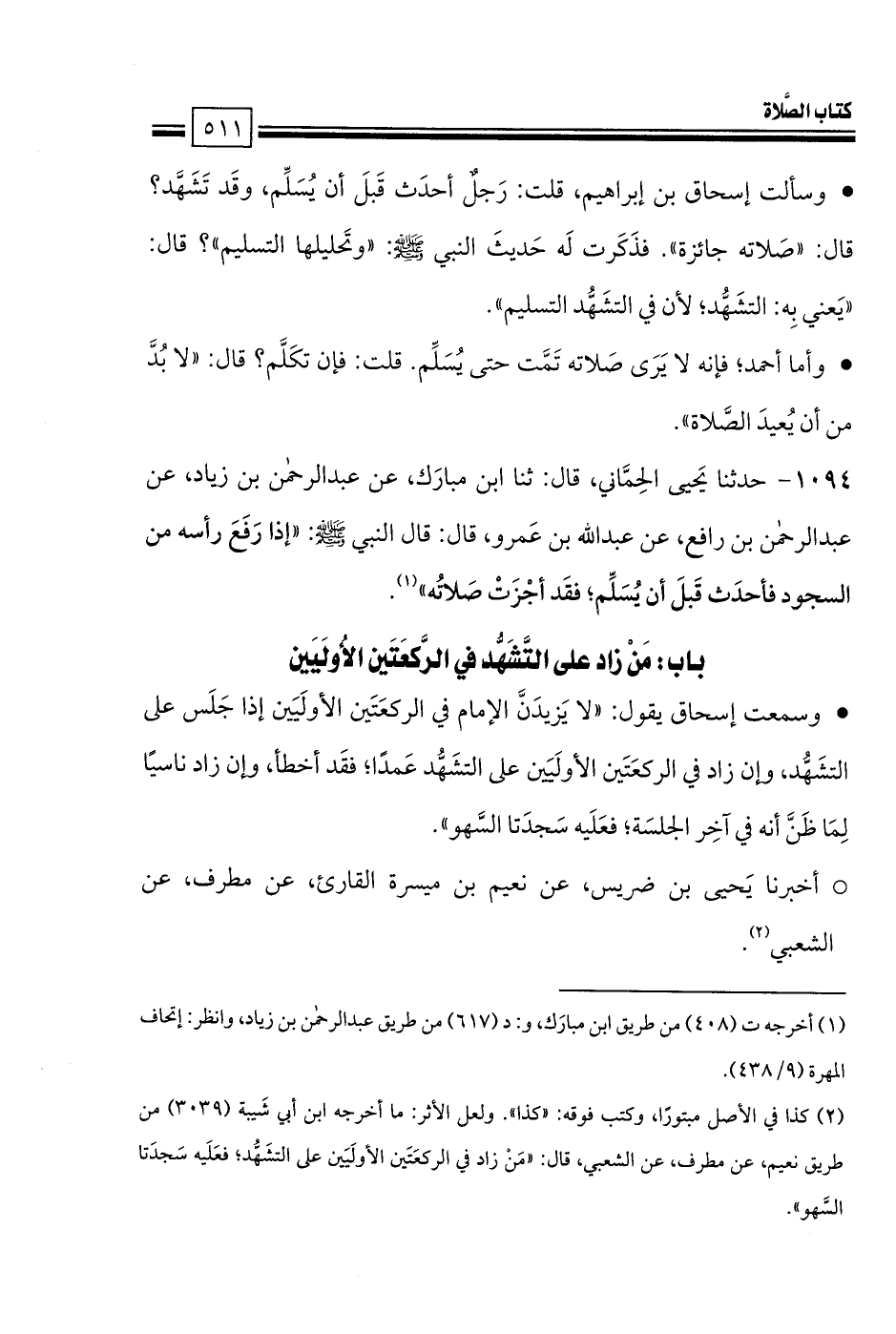 • وسمعت إسحاق يقول: «لا يَزيدَنَّ الإمام في الركعَتَين الأولَيَين إذا جَلَس على التشَهُّد، وإن زاد في الركعَتَين الأولَيَين على التشَهُّد عَمدًا؛ فقَد أخطأ، وإن زاد ناسيًا لِمَا ظَنَّ أنه في آخِر الجلسَة؛ فعَلَيه سَجدَتا السَّهو».