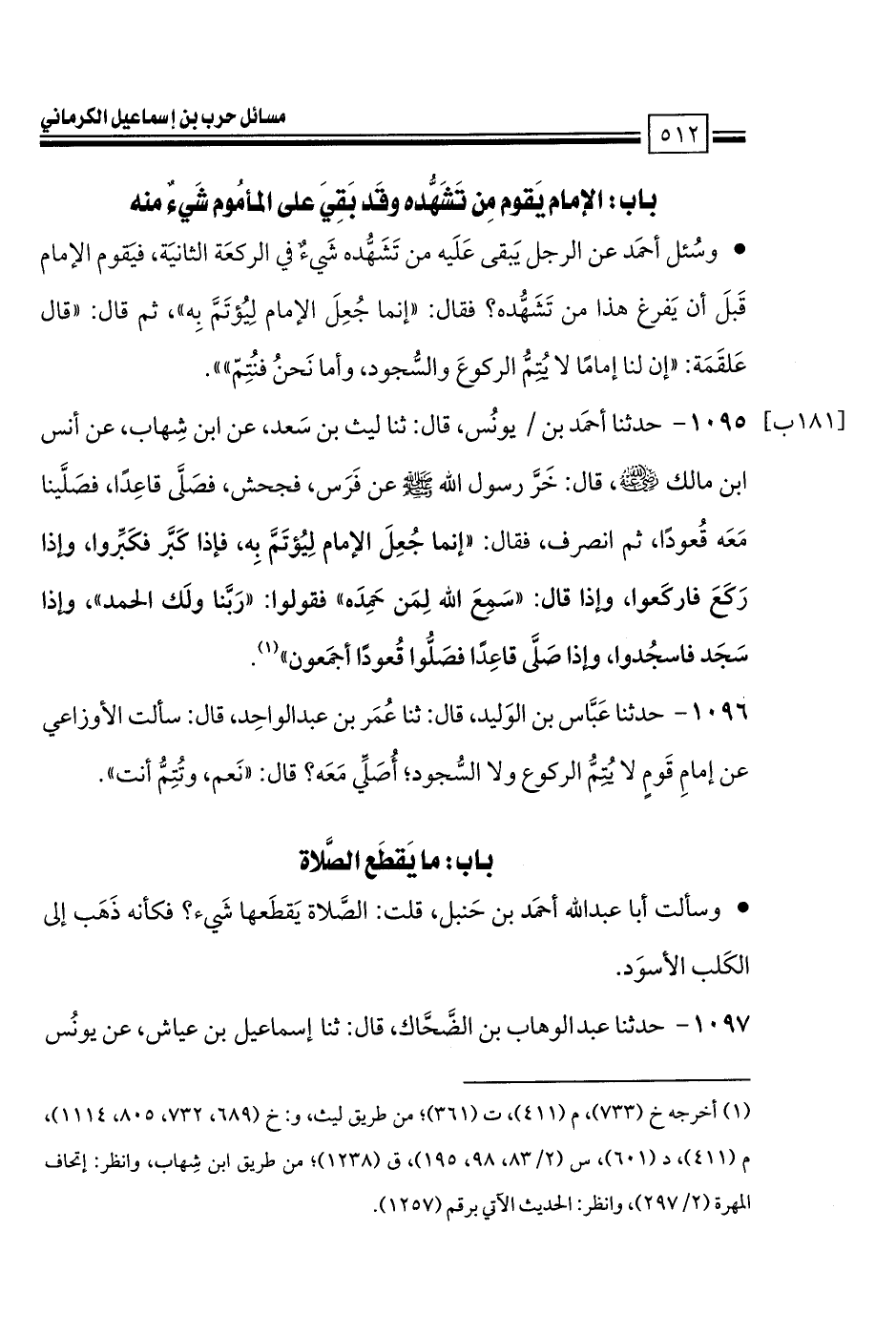 • وسألت أبا عبد الله أحمَد بن حَنبل، قلت: الصَّلاة يَقطَعها شَيء؟ فكأنه ذَهَب إلى الكَلب الأسوَد.