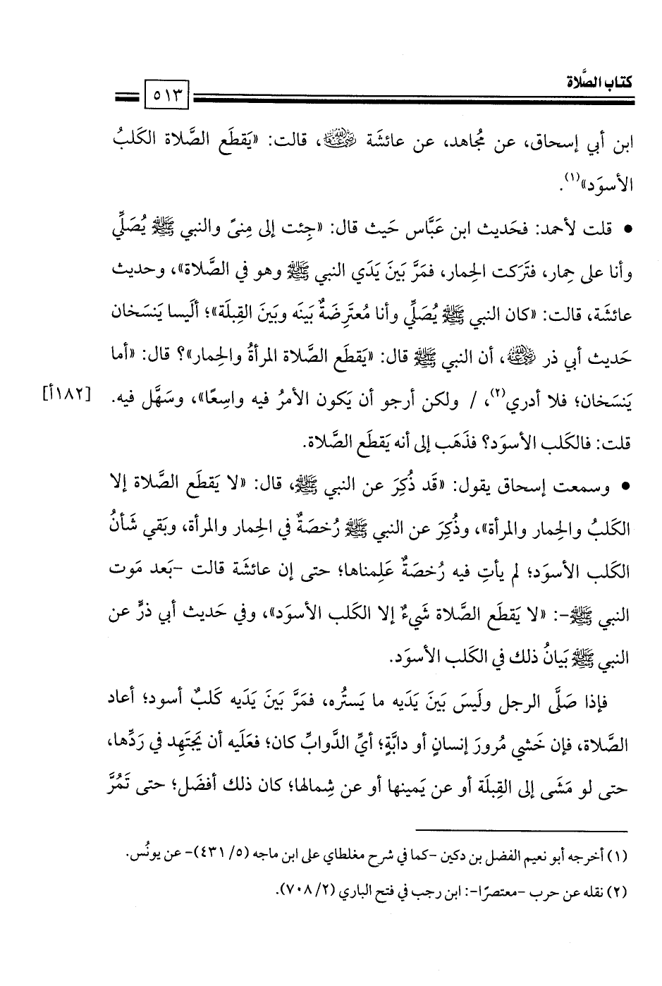• قلت لأحمد: فحَديث ابن عَبَّاس حَيث قال: «جِئت إلى مِنىً والنبي صلى الله عليه وسلم يُصَلِّي وأنا على حِمار، فتَرَكت الحِمار، فمَرَّ بَينَ يَدَي النبي صلى الله عليه وسلم وهو في الصَّلاة»، وحديث عائشَة، قالت: «كان النبي صلى الله عليه وسلم يُصَلِّي وأنا مُعتَرِضَةٌ بَينَه وبَينَ القِبلَة»؛ ألَيسا يَنسَخان حَديث أبي ذر -رضي الله عنه-، أن النبي صلى الله عليه وسلم قال: «يَقطَع الصَّلاة المرأةُ والحِمار»؟ قال: «أما يَنسَخان؛ فلا أدري، ولكن أرجو أن يَكون الأمرُ فيه واسِعًا»، وسَهَّل فيه. قلت: فالكَلب الأسوَد؟ فذَهَب إلى أنه يَقطَع الصَّلاة.