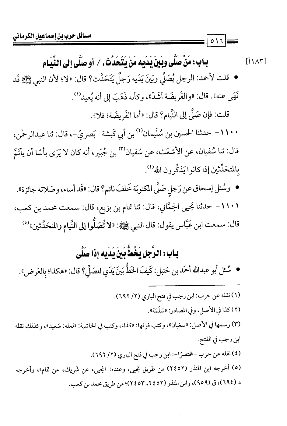 • قلت لأحمد: الرجل يُصَلِّي وبَينَ يَدَيه رَجلٌ يَتَحَدَّث؟ قال: «لا؛ لأن النبي صلى الله عليه وسلم قَد نَهَى عنه». قال: «والفَريضَة أشَدّ»، وكأنه ذَهَبَ إلى أنه يُعيد.