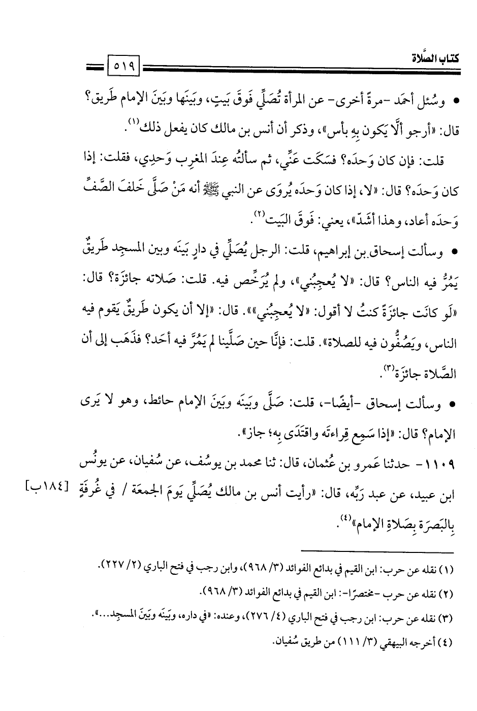 • وسألت إسحاق بن إبراهيم، قلت: الرجل يُصَلِّي في دارٍ بَينَه وبين المسجِد طَريقٌ يَمُرُّ فيه الناس؟ قال: «لا يُعجِبُني»، ولم يُرَخِّص فيه. قلت: صَلاته جائزَة؟ قال: «لَو كانَت جائزَةً كنتُ لا أقول: «لا يُعجِبُني»». قال: «إلا أن يكون طَريقٌ يَقوم فيه الناس، ويَصُفُّون فيه للصلاة». قلت: فإنَّا حين صَلَّينا لم يَمُرَّ فيه أحَد؟ فذَهَب إلى أن الصَّلاة جائزَة.