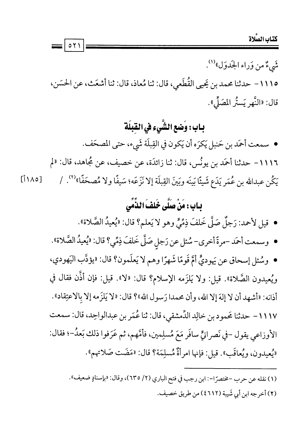 • سمعت أحمَد بن حَنبل يَكرَه أن يَكون في القِبلَة شَيء، حتى المصحَف.