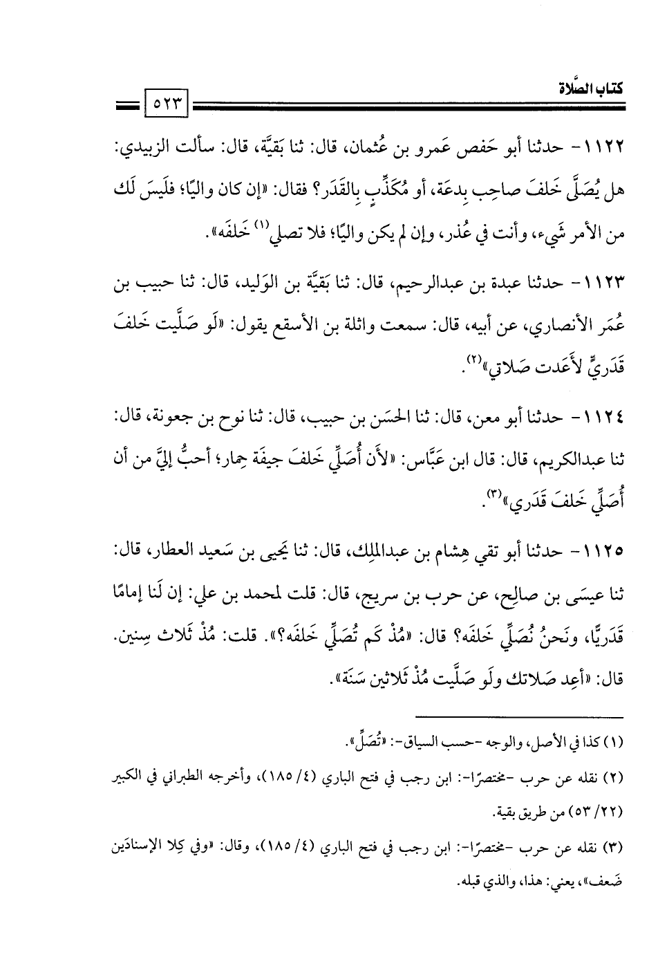 1123 - حدثنا عبدة بن عبد الرحيم، قال: ثنا بَقيَّة بن الوَليد، قال: ثنا حبيب بن عُمَر الأنصاري، عن أبيه، قال: سمعت واثلة بن الأسقع يقول: «لَو صَلَّيت خَلفَ قَدَريٍّ لأَعَدت صَلاتي».