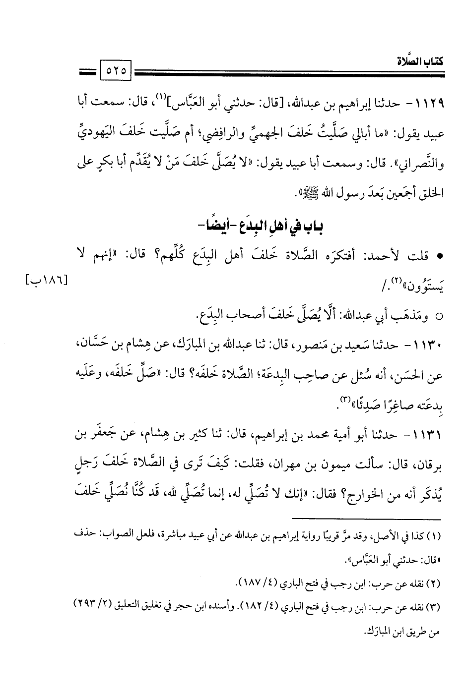 1129 - حدثنا إبراهيم بن عبد الله، [قال: حدثني أبو العَبَّاس] (1)، قال: سمعت أبا عبيد يقول: «ما أبالي صَلَّيتُ خَلفَ الجهميِّ والرافِضي؛ أم صَلَّيت خَلفَ اليَهوديِّ والنَّصراني». قال: وسمعت أبا عبيد يقول: «لا يُصَلَّى خَلفَ مَنْ لا يُقَدِّم أبا بكرٍ على الخلق أجمَعين بَعدَ رسول الله صلى الله عليه وسلم».