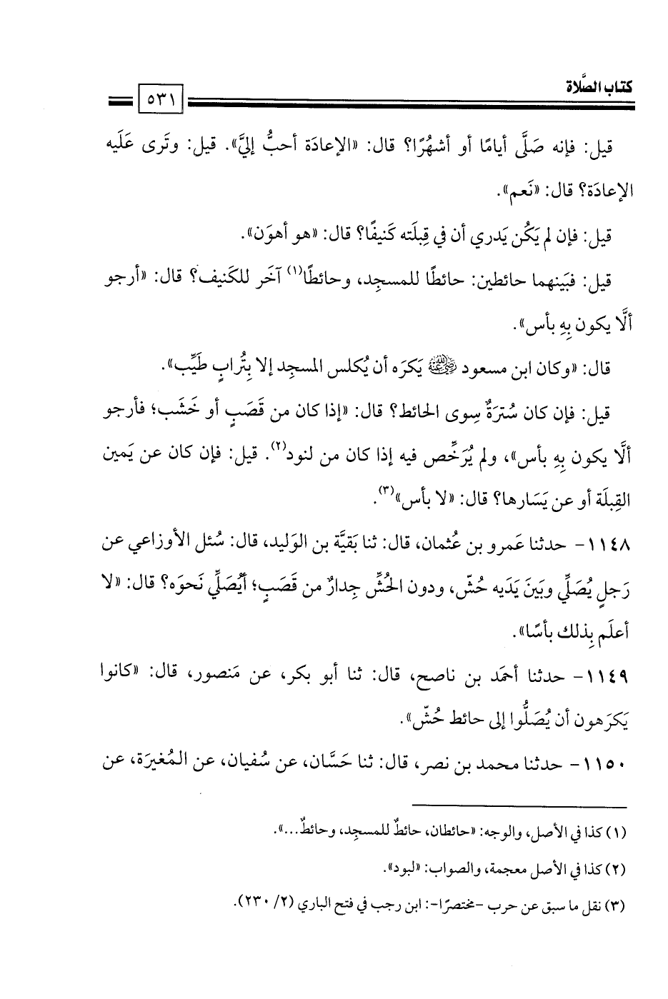 1148 - حدثنا عَمرو بن عُثمان، قال: ثنا بَقيَّة بن الوَليد، قال: سُئل الأوزاعي عن رَجلٍ يُصَلِّي وبَينَ يَدَيه حُشّ، ودون الحُشِّ جِدارٌ من قَصَبٍ؛ أيُصَلِّي نَحوَه؟ قال: «لا أعلَم بِذلك بأسًا».