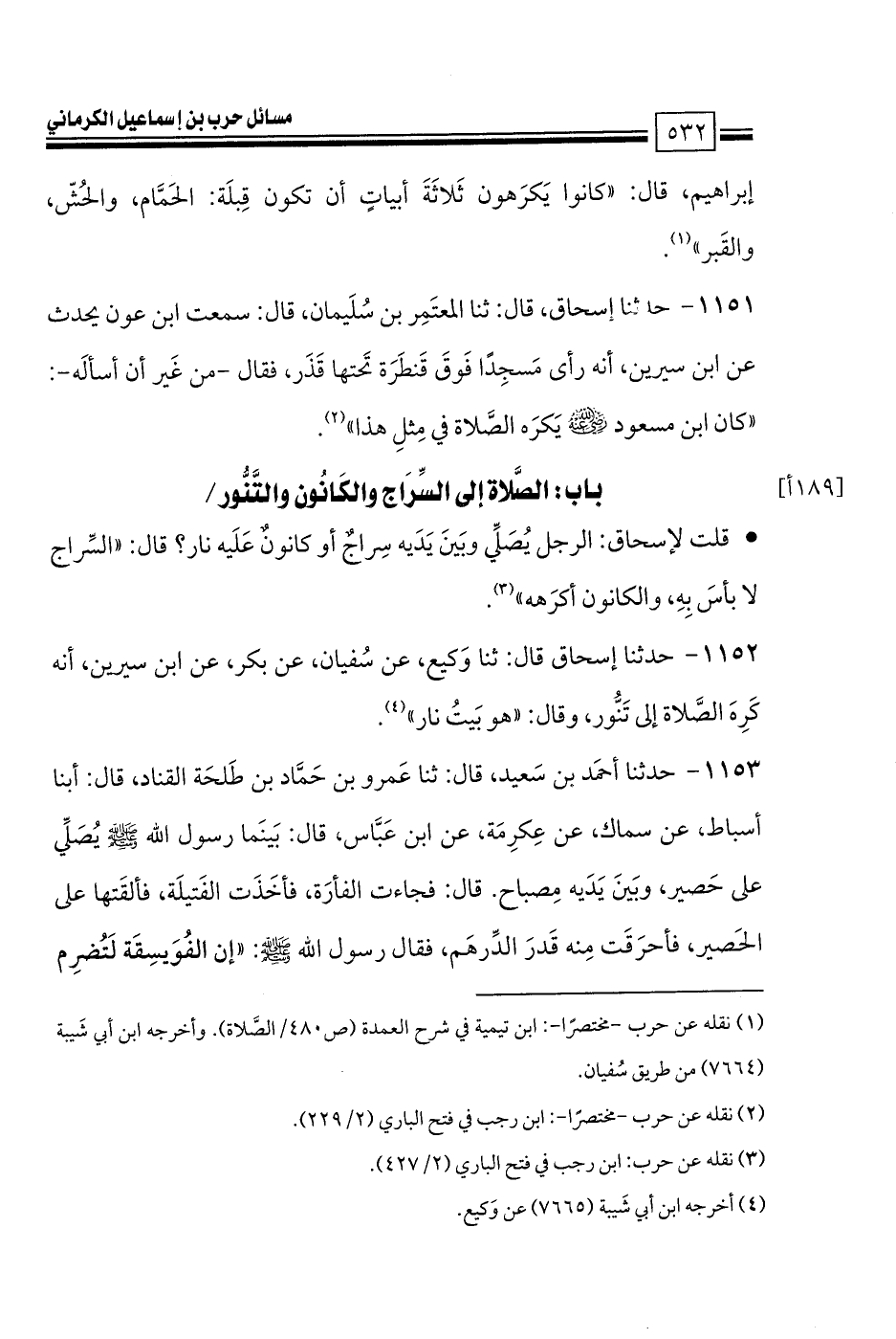 • قلت لإسحاق: الرجل يُصَلِّي وبَينَ يَدَيه سِراجٌ أو كانونٌ عَلَيه نار؟ قال: «السِّراج لا بأسَ بِهِ، والكانون أكرَهه».