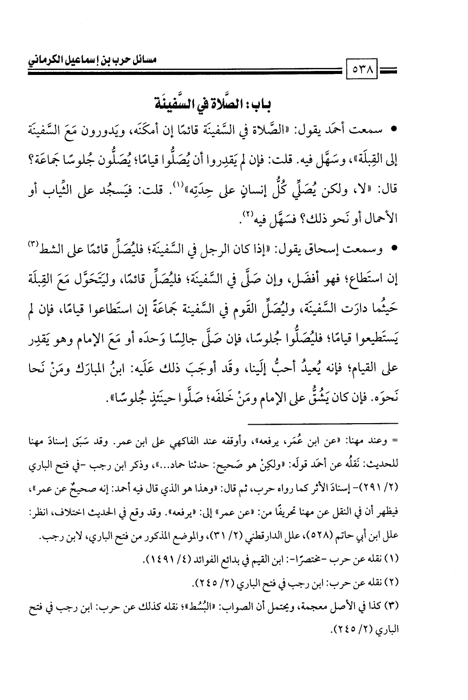 • وسمعت إسحاق يقول: «إذا كان الرجل في السَّفينَة؛ فليُصَلِّ قائمًا على الشط (1) إن استَطاع؛ فهو أفضَل، وإن صَلَّى في السَّفينَة؛ فليُصَلِّ قائمًا، وليَتَحَوَّل مَعَ القِبلَة حَيثُما دارَت السَّفينَة، وليُصَلِّ القَوم في السَّفينة جَماعَةً إن استَطاعوا قيامًا، فإن لم يَستَطيعوا قيامًا؛ فليُصَلُّوا جُلوسًا، فإن صَلَّى جالِسًا وَحدَه أو مَعَ الإمام وهو يَقدِر على القيام؛ فإنه يُعيدُ أحبُّ إلَينا، وقَد أوجَبَ ذلك عَلَيه: ابنُ المبارَك ومَنْ نَحا نَحوَه. فإن كان يَشُقُّ على الإمام ومَنْ خَلفَه؛ صَلَّوا حينَئذٍ جُلوسًا».