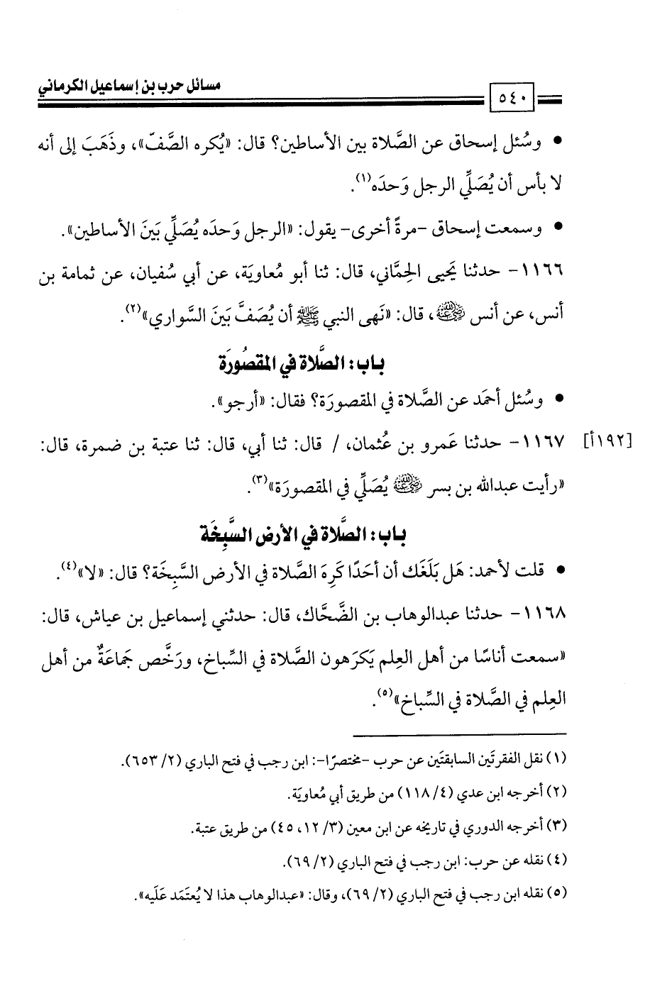 1168 - حدثنا عبد الوهاب بن الضَّحَّاك، قال: حدثني إسماعيل بن عياش، قال: «سمعت أناسًا من أهل العِلم يَكرَهون الصَّلاة في السِّباخ، ورَخَّص جَماعَةٌ من أهل العِلم في الصَّلاة في السِّباخ».