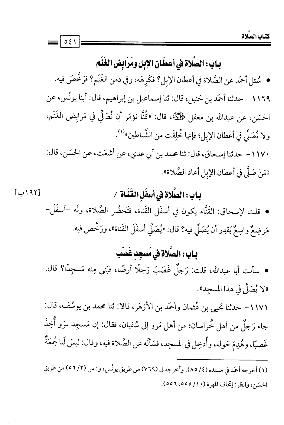 1169 - حدثنا أحمَد بن حَنبل، قال: ثنا إسماعيل بن إبراهيم، قال: أبنا يونُس، عن الحسَن، عن عبد الله بن مغفل -رضي الله عنه-، قال: «كُنَّا نؤمَر أن نُصَلِّي في مَرابِض الغَنَم، ولا نُصَلِّي في أعطان الإبِل؛ فإنها خُلِقَت من الشَّياطين».