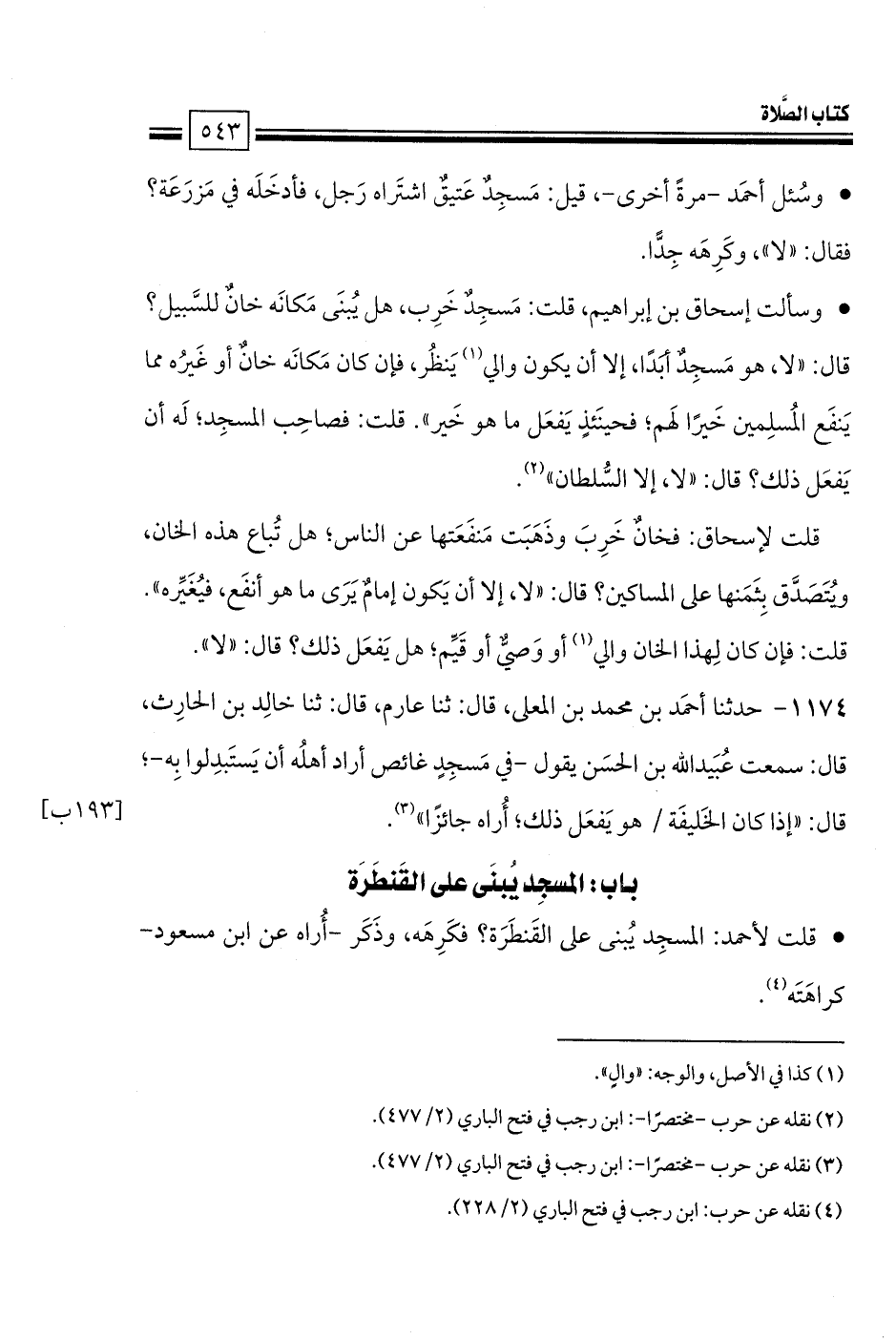 • وسألت إسحاق بن إبراهيم، قلت: مَسجِدٌ خَرِب، هل يُبنَى مَكانَه خانٌ للسَّبيل؟ قال: «لا، هو مَسجِدٌ أبَدًا، إلا أن يكون والي (1) يَنظُر، فإن كان مَكانَه خانٌ أو غَيرُه مما يَنفَع المُسلِمين خَيرًا لَهم؛ فحينَئذٍ يَفعَل ما هو خَير». قلت: فصاحِب المسجِد؛ لَه أن يَفعَل ذلك؟ قال: «لا، إلا السُّلطان».