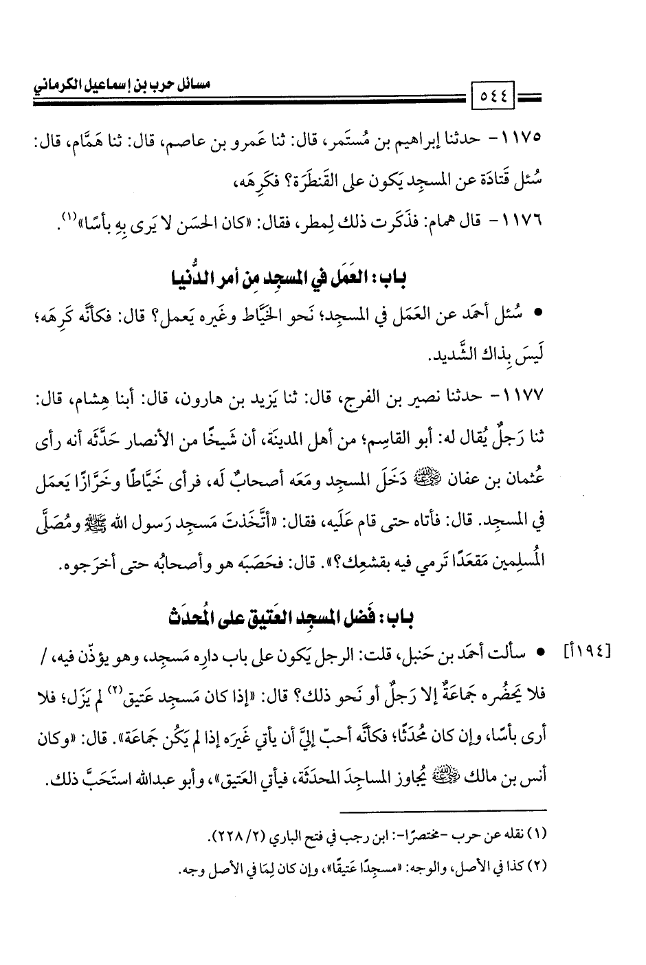 • سألت أحمَد بن حَنبل، قلت: الرجل يَكون على باب دارِه مَسجِد، وهو يؤذّن فيه، فلا يَحضُره جَماعَةٌ إلا رَجلٌ أو نَحو ذلك؟ قال: «إذا كان مَسجِد عَتيق (1) لم يَزَل؛ فلا أرى بأسًا، وإن كان مُحدَثًا؛ فكأنَّه أحبّ إليَّ أن يأتي غَيرَه إذا لم يَكُن جَماعَة». قال: «وكان أنس بن مالك -رضي الله عنه- يُجاوز المساجِدَ المحدَثَة، فيأتي العَتيق»، وأبو عبد الله استَحَبَّ ذلك.