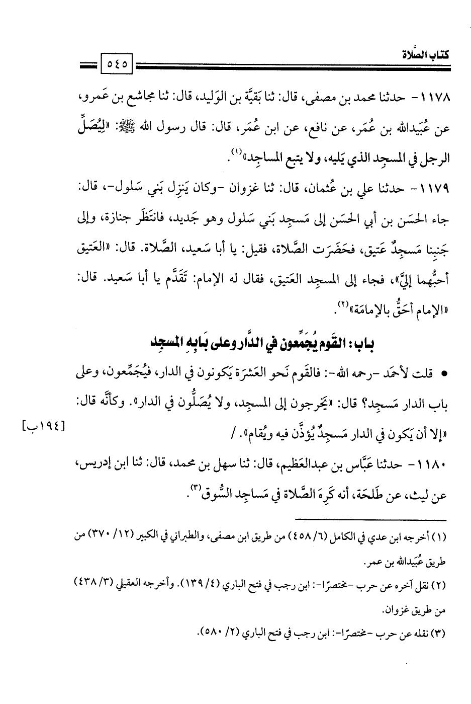 1179 - حدثنا علي بن عُثمان، قال: ثنا غزوان -وكان يَنزِل بَني سَلول-، قال: جاء الحسَن بن أبي الحسَن إلى مَسجِد بَني سَلول وهو جَديد، فانتَظَر جنازة، وإلى جَنبِنا مَسجِدٌ عَتيق، فحَضَرَت الصَّلاة، فقيل: يا أبا سَعيد، الصَّلاة. قال: «العَتيق أحبُّهما إليَّ»، فجاء إلى المسجِد العَتيق، فقال له الإمام: تَقَدَّم يا أبا سَعيد. قال: «الإمام أحَقُّ بالإمامَة».