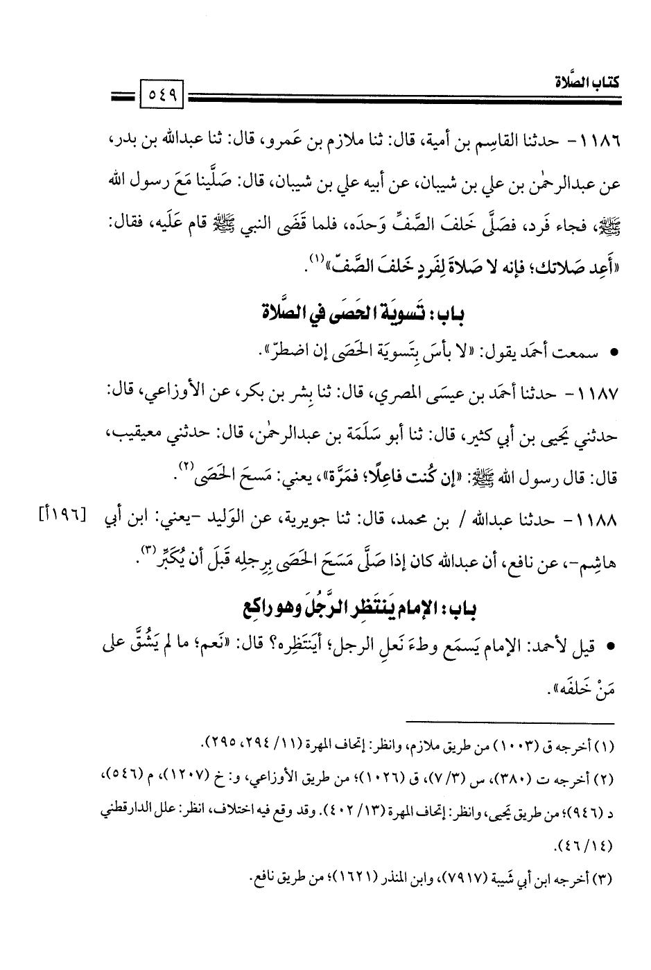 1186 - حدثنا القاسِم بن أمية، قال: ثنا ملازم بن عَمرو، قال: ثنا عبد الله بن بدر، عن عبد الرحمن بن علي بن شيبان، عن أبيه علي بن شيبان، قال: صَلَّينا مَعَ رسول الله صلى الله عليه وسلم، فجاء فَرد، فصَلَّى خَلفَ الصَّفِّ وَحدَه، فلما قَضَى النبي صلى الله عليه وسلم قام عَلَيه، فقال: «أَعِد صَلاتك؛ فإنه لا صَلاةَ لِفَردٍ خَلفَ الصَّفّ».