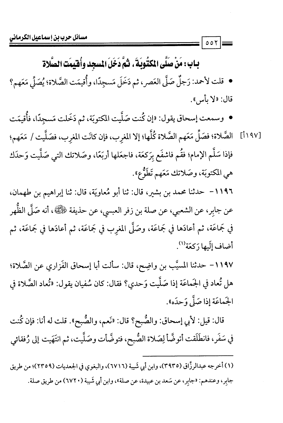 1197 - حدثنا المسيَّب بن واضِح، قال: سألت أبا إسحاق الفَزاري عن الصَّلاة؛ هل تُعاد في الجَماعَة إذا صَلَّيت وَحدي؟ فقال: كان سُفيان يقول: «تُعاد الصَّلاة في الجَماعَة إذا صَلَّى وَحدَه».