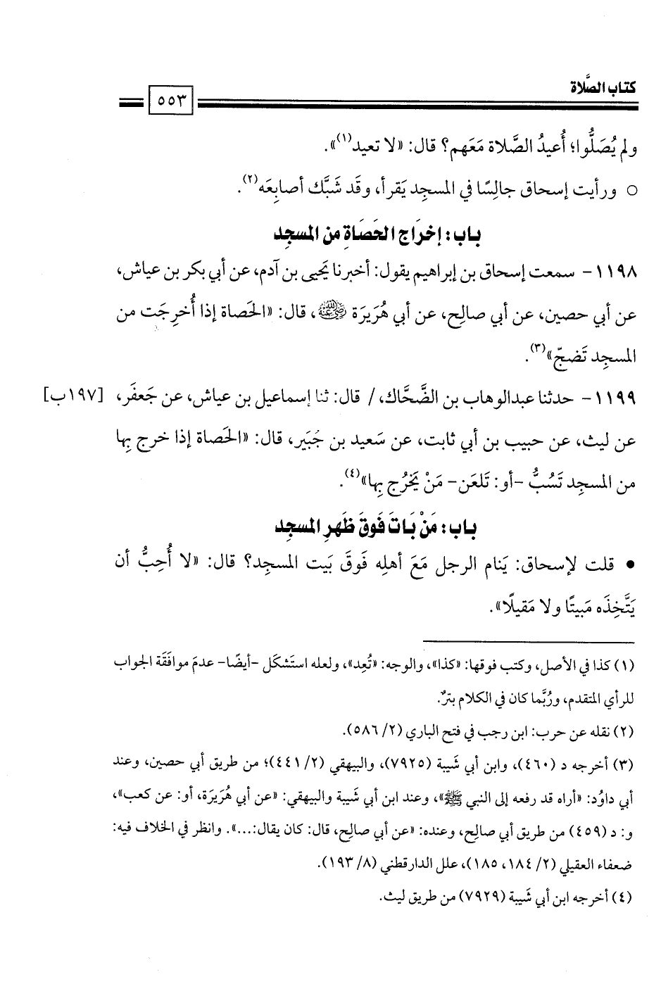 1198 - سمعت إسحاق بن إبراهيم يقول: أخبرنا يَحيى بن آدم، عن أبي بكر بن عياش، عن أبي حصين، عن أبي صالِح، عن أبي هُرَيرَة -رضي الله عنه-، قال: «الحَصاة إذا أُخرِجَت من المسجِد تَضجّ».