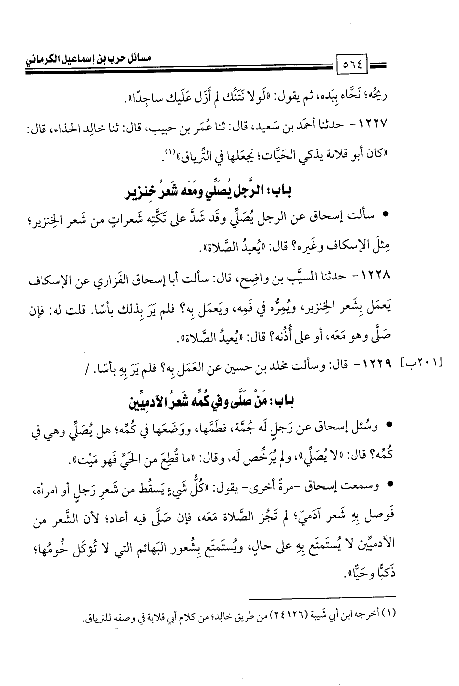 • سألت إسحاق عن الرجل يُصَلِّي وقَد شَدَّ على تَكَّتِه شَعراتٍ من شَعر الخِنزير؛ مِثلَ الإسكاف وغَيره؟ قال: «يُعيدُ الصَّلاة».