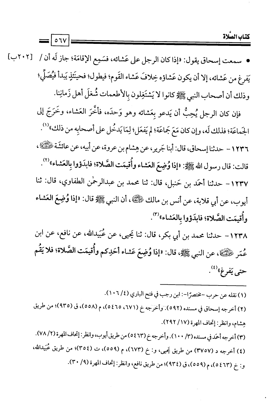 • سمعت إسحاق يقول: «إذا كان الرجل على عَشائه، فسَمِع الإقامَة؛ جاز لَه أن يَفرغ من عَشائه، إلا أن يكون عَشاؤه خِلافَ عَشاء القَوم؛ فيطول؛ فحينَئذٍ يَبدأ فيُصَلِّي؛ وذلك أن أصحاب النبي صلى الله عليه وسلم كانوا لا يَشتَغِلون بِالأطعمات شُغلَ أهل زَمانِنا.