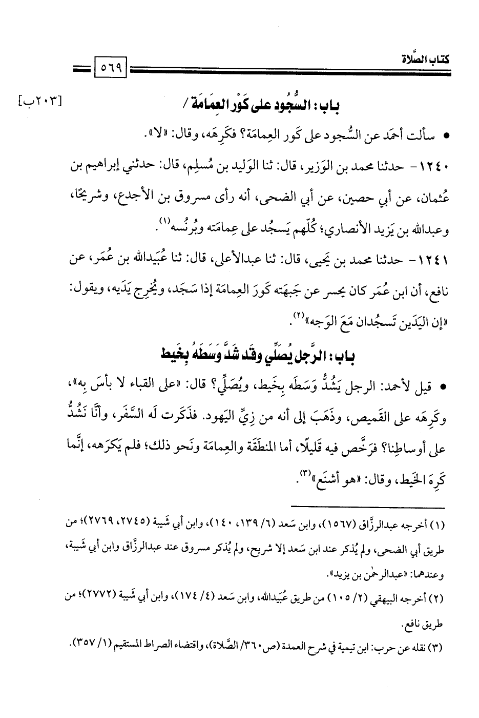 1240 - حدثنا محمد بن الوَزير، قال: ثنا الوَليد بن مُسلِم، قال: حدثني إبراهيم بن عُثمان، عن أبي حصين، عن أبي الضحى، أنه رأى مسروق بن الأجدع، وشريحًا، وعبد الله بن يَزيد الأنصاري؛ كُلّهم يَسجُد على عِمامَته وبُرنُسه.