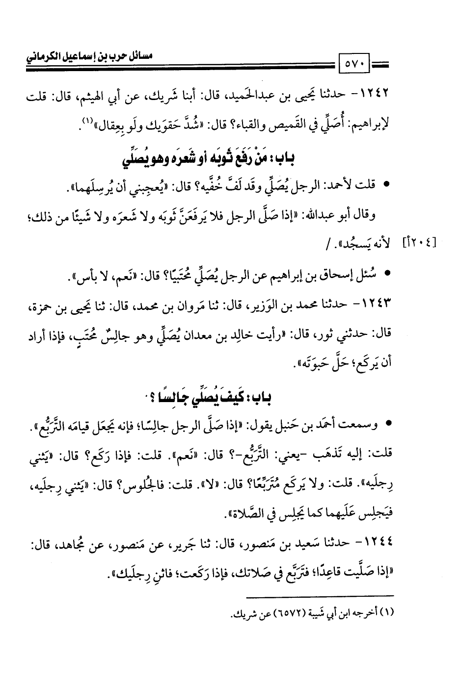 1244 - حدثنا سَعيد بن مَنصور، قال: ثنا جَرير، عن مَنصور، عن مُجاهد، قال: «إذا صَلَّيت قاعِدًا؛ فتَرَبَّع في صَلاتك، فإذا رَكَعت؛ فاثنِ رِجلَيك».