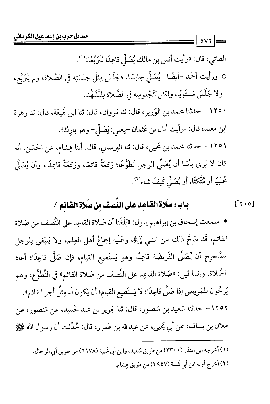 • سمعت إسحاق بن إبراهيم يقول: «بَلَغَنا أن صَلاة القاعِد على النِّصف من صَلاة القائم؛ قَد صَحَّ ذلك عن النبي صلى الله عليه وسلم، وعَلَيه إجماعُ أهل العِلم، ولا يَنبَغي لِلرجل الصَّحيح أن يُصَلِّي الفَريضَة قاعِدًا وهو يَستَطيع القيام، فإن صَلَّى قاعِدًا؛ أعاد الصَّلاة. وإنما قيل: «صَلاة القاعِد على النِّصف من صَلاة القائم» في التَّطَوُّع، وهم يَرجُون للمَريض إذا صَلَّى قاعِدًا؛ لا يَستَطيع القيام؛ أن يَكون لَه مِثلُ أجر القائم».
