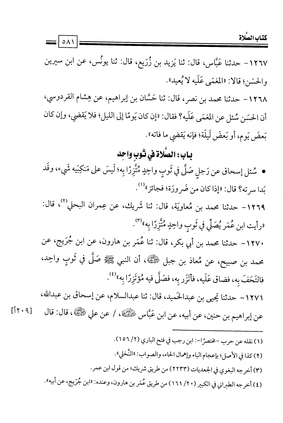 1269 - حدثنا محمد بن مُعاويَة، قال: ثنا شَريك، عن عِمران البحلي (1)، قال: «رأيت ابن عُمَر يُصَلِّي في ثَوبٍ واحِدٍ مُتَّزِرًا بِه».