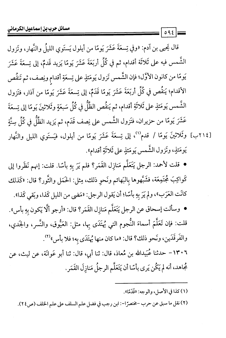 • وسألت إسحاق عن الرجل يَتَعَلَّم مَنازِل القَمَر؟ قال: «أرجو ألَّا يَكون بِهِ بأس». قلت: فإن تَعَلَّمَ أسماءَ النُّجوم التي يُهتَدَى بِها، مثل: العَيُّوق، والنَّسر، والجَدي، والفَرقَدَين، ونَحو ذلك؟ قال: «ما كان منها يُهتَدَى بِه؛ فلا بأس».
