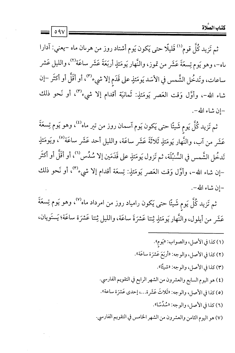 ثم تَزيد كُلَّ قوم (1) قَليلًا حتى يَكون يَوم أشتاد روز من هرنان ماه -يعني: آدارا ناه-، وهو يَوم تِسعَةَ عَشَر من تموز، والنَّهار يَومَئذٍ أربَعَةَ عَشَر ساعَة (2)، والليل عَشر ساعات، وتَدخُل الشَّمس في الأسَد يَومَئذٍ على قَدَمٍ إلا شيء (3)، أو أقَلَّ أو أكثَر -إن شاء الله-، وأوَّل وَقت العَصر يَومَئذٍ: ثَمانيَة أقدام إلا شيء، أو نَحو ذلك -إن شاء الله-.