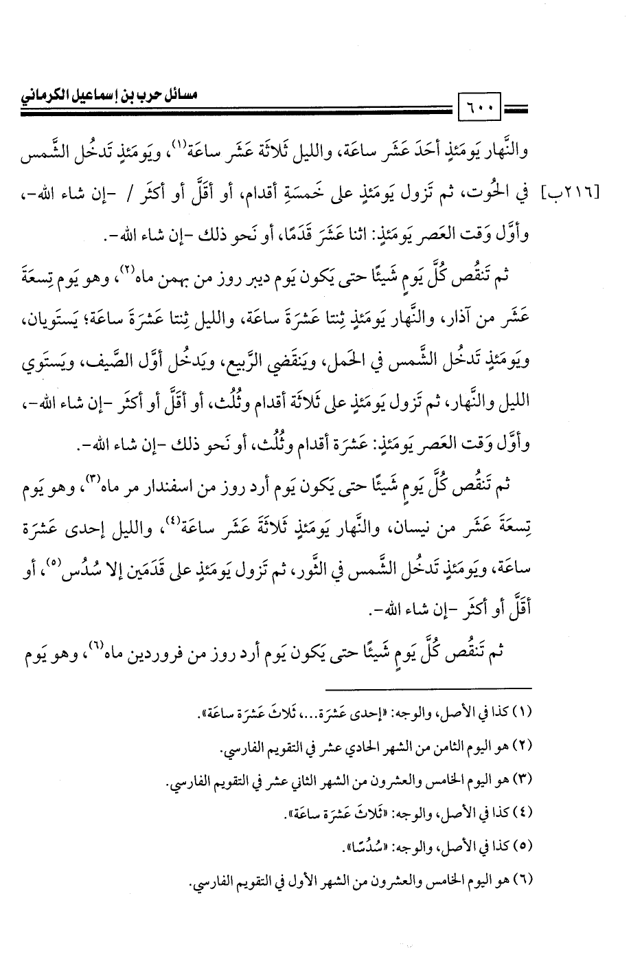 ثم تَنقُص كُلَّ يَومٍ شَيئًا حتى يَكون يَوم أرد روز من فروردين ماه، وهو يَوم -[601]- تِسعَةَ عَشَر من أيار، والنَّهار يَومَئذٍ أربَعَة عَشَر ساعة (2)، والليل عَشر ساعات، ويَومَئذٍ تَدخُل الشَّمس في الجَوزاء، ثم تَزول يَومَئذٍ على قَدَم إلا شَيء (3)، أو أقَلَّ أو أكثَر -إن شاء الله-، وأوَّل وَقت العَصر يَومَئذٍ: ثمانيَة أقدام إلا شيء (3)، أو نَحو ذلك -إن شاء الله-.