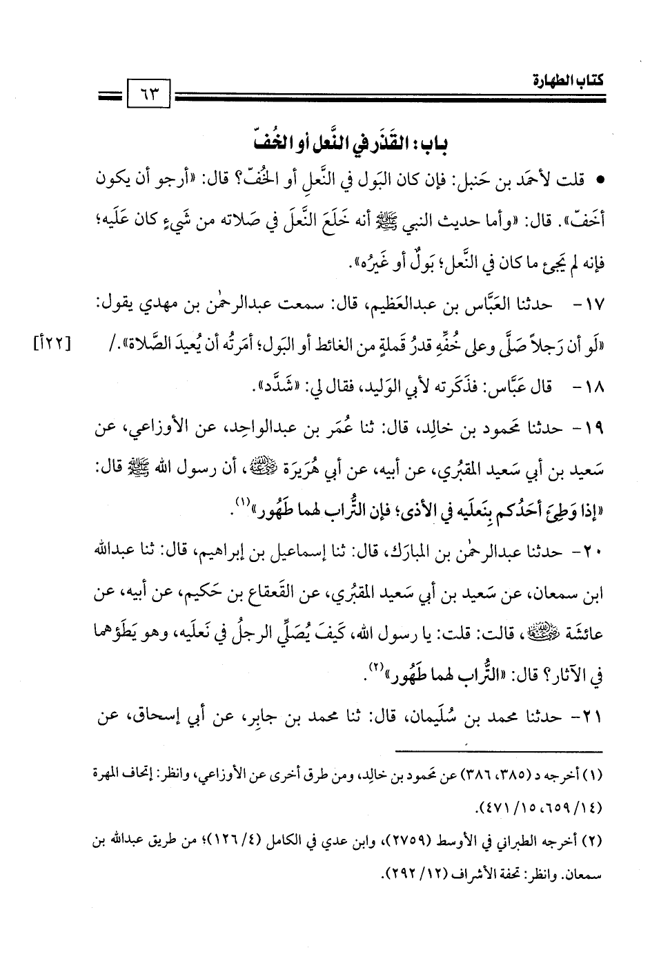17 - حدثنا العَبَّاس بن عبد العَظيم، قال: سمعت عبد الرحمن بن مهدي يقول: «لَو أن رَجلاً صَلَّى وعلى خُفِّهِ قدرُ قَملةٍ من الغائط أو البَول؛ أمَرتُه أن يُعيدَ الصَّلاة».