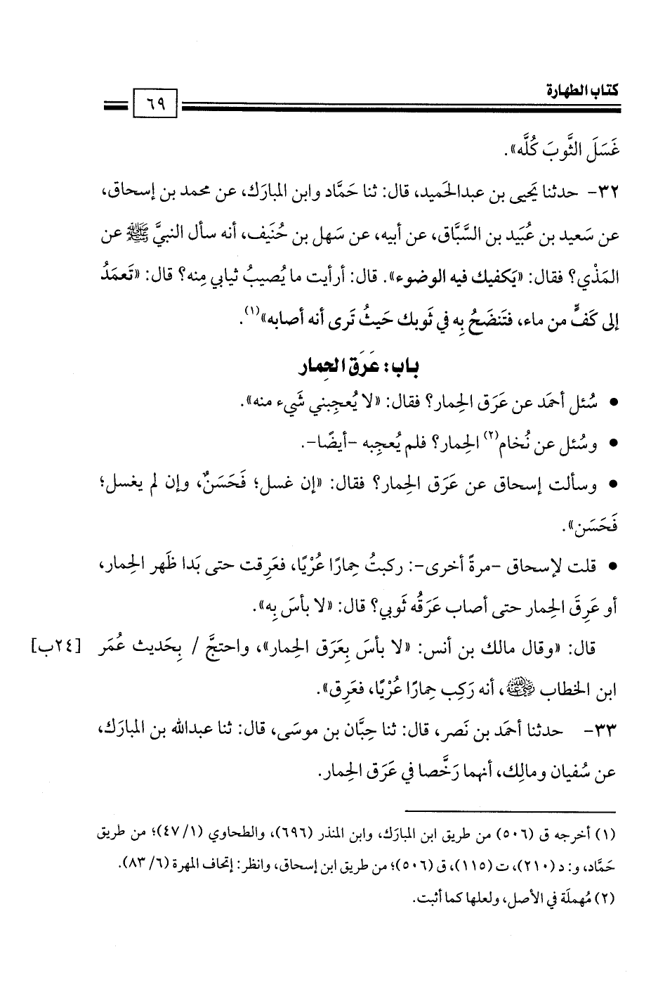 33 - حدثنا أحمَد بن نَصر، قال: ثنا حِبَّان بن موسَى، قال: ثنا عبد الله بن المبارَك، عن سُفيان ومالِك، أنهما رَخَّصا في عَرَق الحِمار.