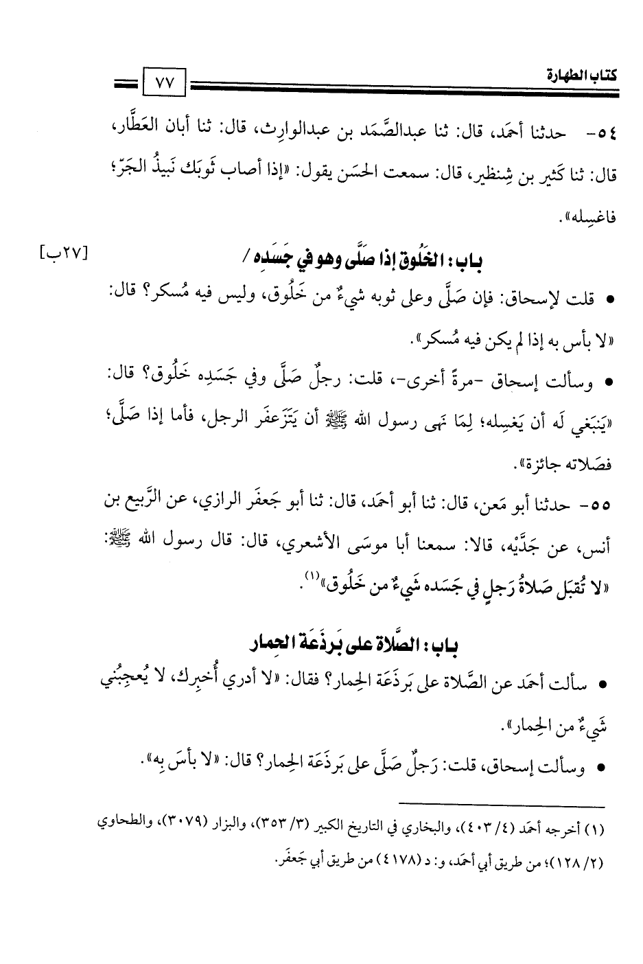 54 - حدثنا أحمَد، قال: ثنا عبد الصَّمَد بن عبد الوارِث، قال: ثنا أبان العَطَّار، قال: ثنا كَثير بن شِنظير، قال: سمعت الحسَن يقول: «إذا أصاب ثَوبَك نَبيذُ الجَرّ؛ فاغسِله».