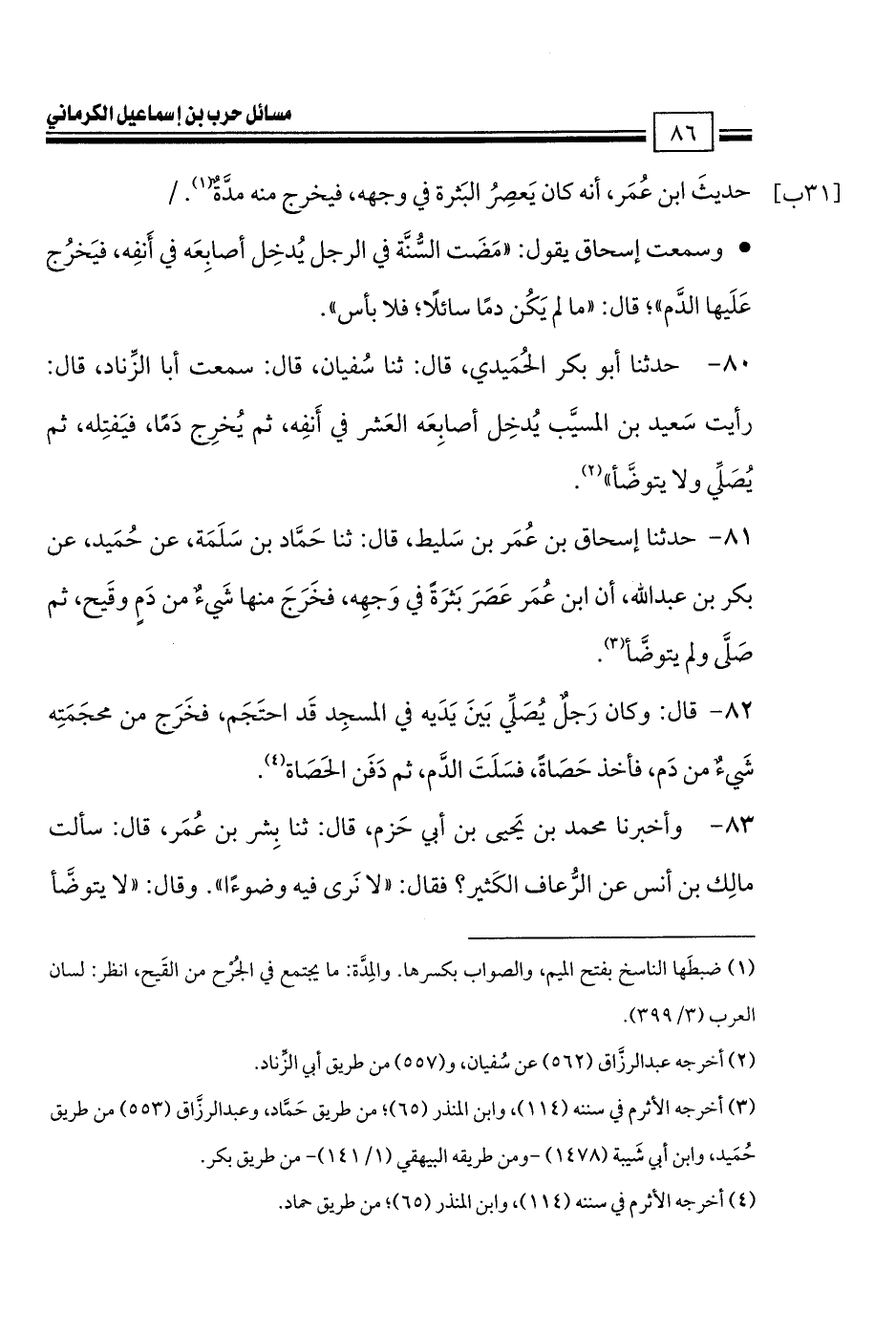80 - حدثنا أبو بكر الحُمَيدي، قال: ثنا سُفيان، قال: سمعت أبا الزِّناد، قال: رأيت سَعيد بن المسيَّب يُدخِل أصابِعَه العَشر في أَنفِه، ثم يُخرِج دَمًا، فيَفتِله، ثم يُصَلِّي ولا يتوضَّأ».