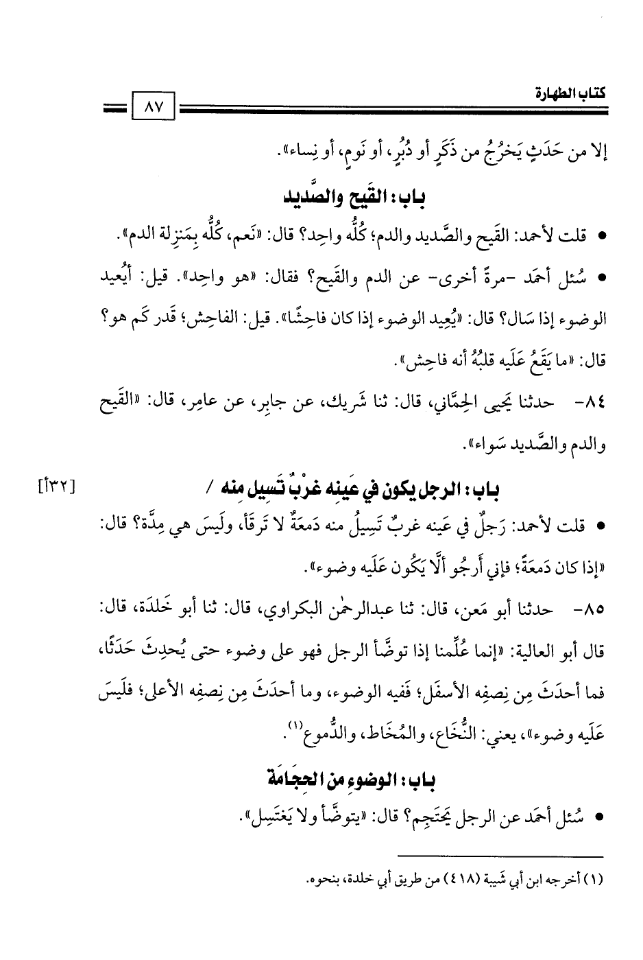 • قلت لأحمد: القَيح والصَّديد والدم؛ كُلُّه واحِد؟ قال: «نَعم، كُلُّه بِمَنزِلة الدم».