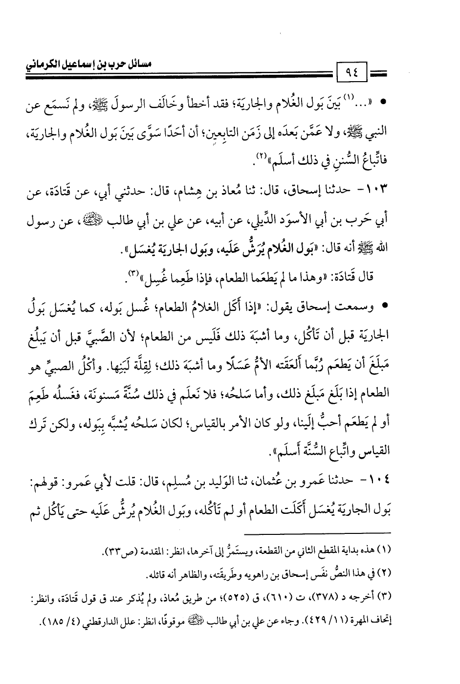 • وسمعت إسحاق يقول: «إذا أَكَل الغلامُ الطعام؛ غُسل بَوله، كما يُغسَل بَولُ الجاريَة قبل أن تَأكُل، وما أشبَهَ ذلك فَلَيس من الطعام؛ لأن الصَّبيَّ قبل أن يَبلُغ مَبلَغَ أن يَطعَم رُبَّما أَلعَقَته الأمُّ عَسَلًا وما أشبَهَ ذلك؛ لِقِلَّة لَبَنِها. وأكْلُ الصبيِّ هو الطعام إذا بَلَغ مَبلَغ ذلك، وأما سَلحُه؛ فلا نَعلَم في ذلك سُنَّةً مَسنونَة، فغَسلُه طَعِمَ أو لم يَطعَم أحبُّ إلَينا، ولو كان الأمر بالقياس؛ لكان سَلحُه يُشبَّه بِبَوله، ولكن تَرك القياس واتِّباع السُّنَّة أَسلَم».