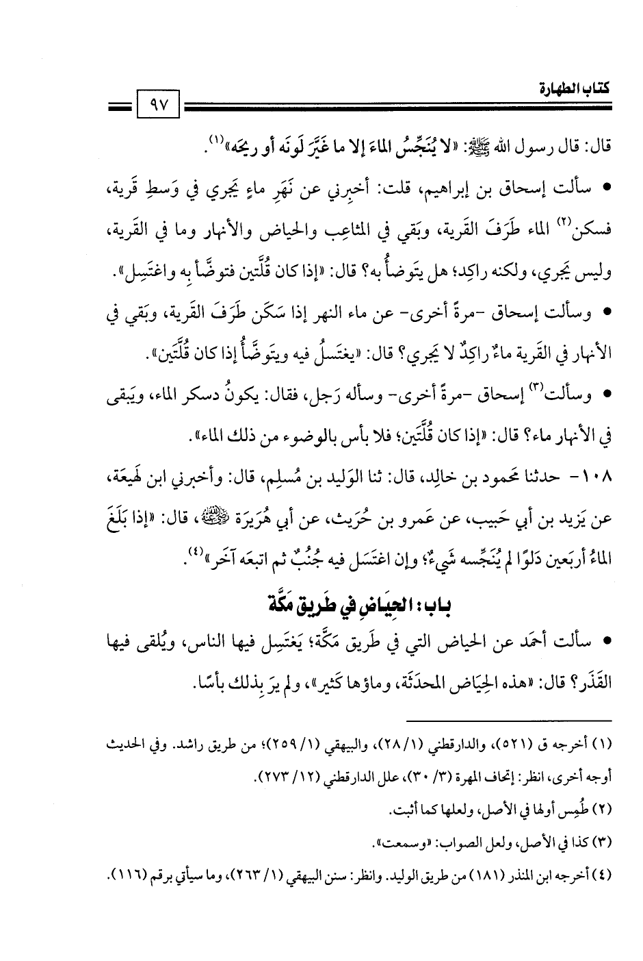 • سألت إسحاق بن إبراهيم، قلت: أخبِرني عن نَهَرِ ماءٍ يَجري في وَسطِ قَرية، فسكن (1) الماء طَرَفَ القَرية، وبَقي في المثاعِب والحياض والأنهار وما في القَرية، وليس يَجري، ولكنه راكِد؛ هل يتَوضأُ به؟ قال: «إذا كان قُلَّتين فتوضَّأ بِه واغتَسِل».