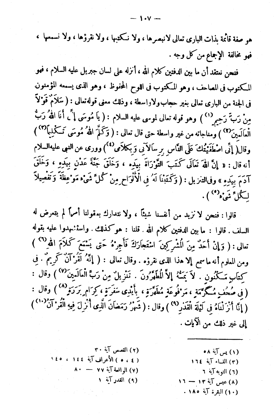 فنحن نعتقد أن ما بين الدفتين كلام الله، أنزله على لسان جبريل عليه السلام، فهو المكتوب في المصاحف، وهو المكتوب في اللوح المحفوظ، وهو الذي يسمعه المؤمنون في الجنة من الباري تعالى بغير حجاب ولا واسطة، وذلك معنى قوله تعالى: {سَلامٌ قَوْلًا مِنْ رَبٍّ رَحِيمٍ} 1 وهو قوله تعالى لموسى عليه السلام: {يَا مُوسَى إِنِّي أَنَا اللَّهُ رَبُّ الْعَالَمِينَ} 2 ومناجاته من غير واسطة حتى قال تعالى: {وَكَلَّمَ اللَّهُ مُوسَى تَكْلِيمًا} 3 وقال: {إِنِّي اصْطَفَيْتُكَ عَلَى النَّاسِ بِرِسَالاتِي وَبِكَلامِي} 4 وروي عن النبي عليه السلام أنه قال: "إن الله تعالى كتب التوراة بيده، وخلق جنة عدن بيده، وخلق آدم بيده" وفي التنزيل: {وَكَتَبْنَا لَهُ فِي الْأَلْوَاحِ مِنْ كُلِّ شَيْءٍ مَوْعِظَةً وَتَفْصِيلًا لِكُلِّ شَيْءٍ} 5.