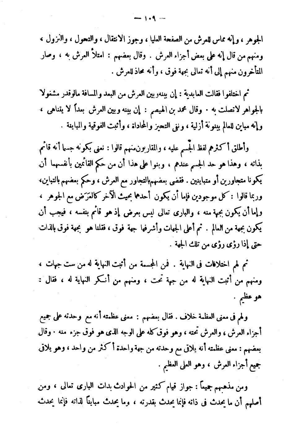 الجوهر، وإنه مماس للعرش من الصفح العليا، وجوز الانتقال، والتحول، والنزول، ومنهم من قال إنه على بعض أجزاء العرش. وقال بعضهم: امتلأ العرش به، وصار المتأخرون منهم إلى أنه تعالى بجهة فوق، وأنه محاذ للعرش.