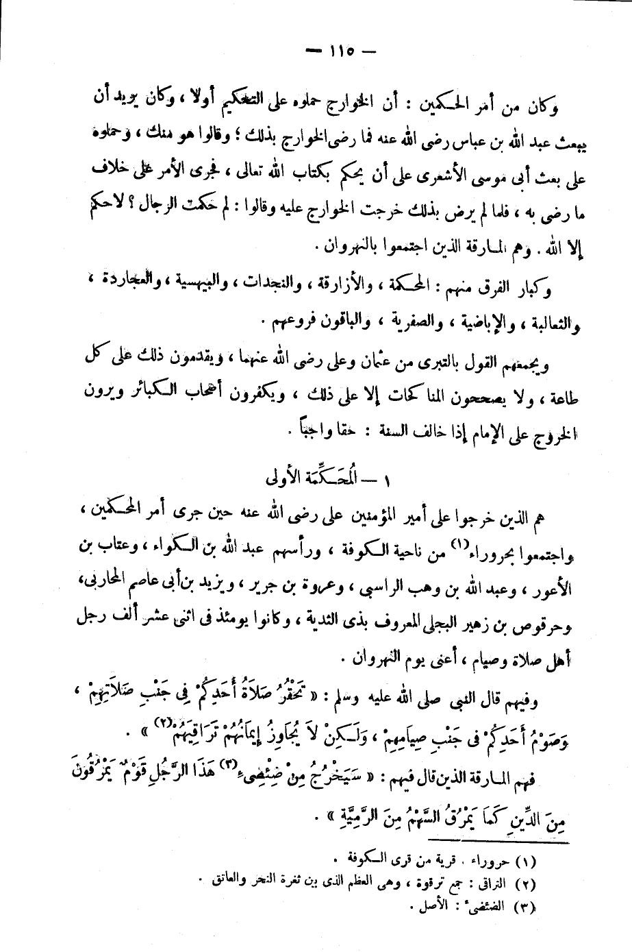 هم الذين خرجوا على أمير المؤمنين علي رضي الله عنه حين جرى أمر المحكمين، واجتمعوا بحروراء1 من ناحية الكوفة، ورأسهم عبد الله بن الكواء، وعتاب بن الأعور، وعبد الله بن وهب الراسبي، وعروة بن جرير، ويزيد بن أبي عاصم المحاربي، وحرقوص بن زهير البجلي المعروف بذي الثدية، وكانوا يومئذ في اثني عشر ألف رجل أهل صلاة وصيام، أعني يوم النهروان.