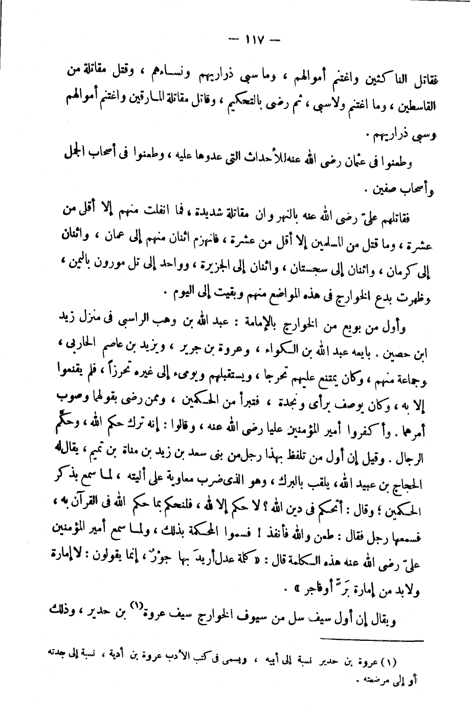 ويقال إن أول سيف سل من سيوف الخوارج سيف عروة1 بن حدير، وذلك