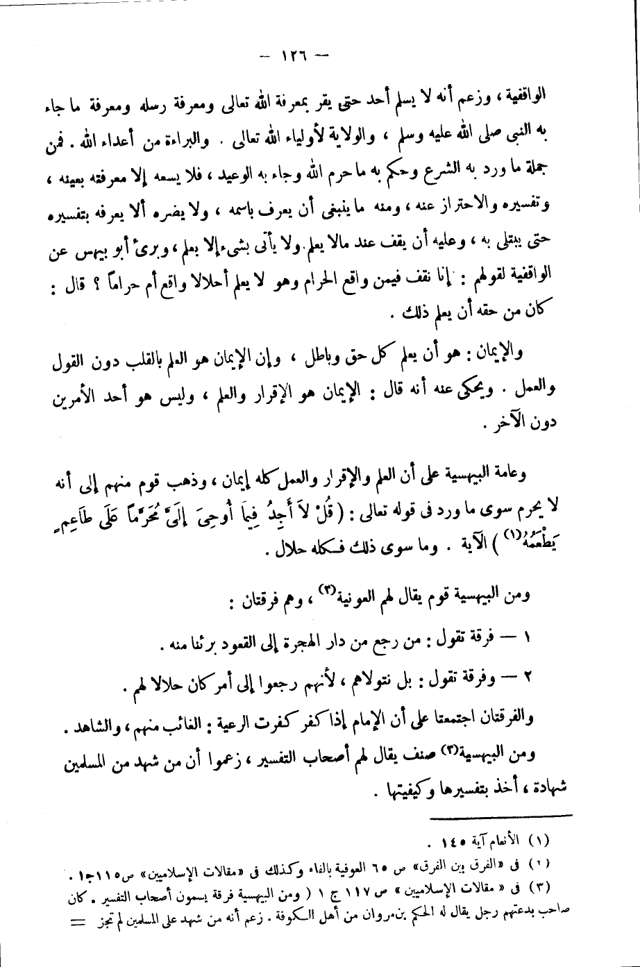 3 في "مقالات الإسلاميين" ص117 ج1 "ومن البيهسية فرقة يسمون أصحاب التفسير. كان صاحب بدعتهم رجل يقال له الحكم بن مروان من أهل الكوفة. زعم أنه من شهد على المسلمين لم تجز شهادتهم إلا بتفسير الشهادة كيف هي؟ قالوا: ولو أن أربعة شهدوا على رجل منهم بالزنا لم تجز شهادتهم حتى يشهدوا كيف هو؟ وهكذا قالوا في سائر الحدود. فبرئت منهم البيهسية على ذلك وسموهم أصحاب التفسير.