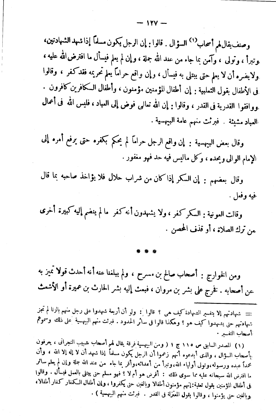 1 المصدر السابق ص115 ج1 "ومن البيهسية فرقة يقال لهم أصحاب شبيب النجراني، يعرفون بأصحاب السؤال، والذي أبدعوه أنهم زعموا أن الرجل يكون مسلما إذا شهد أن لا إله إلا الله، وأن محمدا عبده ورسوله، وتولى أولياء الله، وتبرأ من أعدائه، وأقر بما جاء من عند الله جملة وإن لم يعلم سائر ما افترض الله سبحانه عليه مما سوى ذلك: أفرض هو أم لا؟ فهو مسلم حتى يبتلى بالعمل فيسأل. وقالوا في أطفال المؤمنين بقول ثعلبة: إنهم مؤمنون أطفالا وبالغين حتى يكفروا، وإن أطفال الكفار كفار أطفالا، وبالغين حتى يؤمنوا. وقالوا بقول المعتزلة في القدر. فبرئت منهم البيهسية".