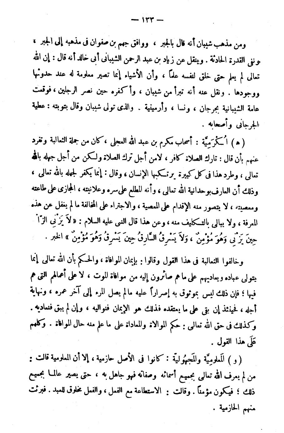 أصحاب مكرم بن عبد الله البجلي، كان من جملة الثعالبة وتفرد عنهم بأن قال: تارك الصلاة كافر، لا من أجل ترك الصلاة ولكن من أجل جهله بالله تعالى، وطرد هذا في كل كبيرة يرتكبها الإنسان، وقال: إنما يكفر لجهله بالله تعالى، وذلك أن العارف بوحدانية الله تعالى، وأنه المطلع على سره وعلانيته، المجازي على طاعته ومعصيته، لا يتصور منه الإقدام على المعصية، والاجتراء على المخالفة ما لم يغفل عن هذه المعرفة، ولا يبالي بالتكليف منه، وعن هذا قال النبي عليه السلام: "لا يزني الزاني حين يزني وهو مؤمن، ولا يسرق السارق حين يسرق وهو مؤمن" الخبر.
